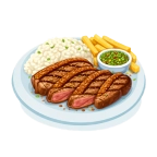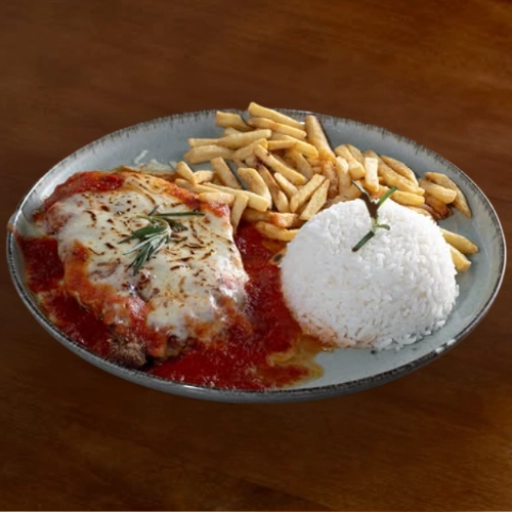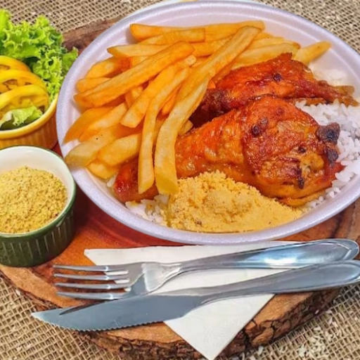 Arroz, feijão carioca, 1 mistura, farofa e batata frita.